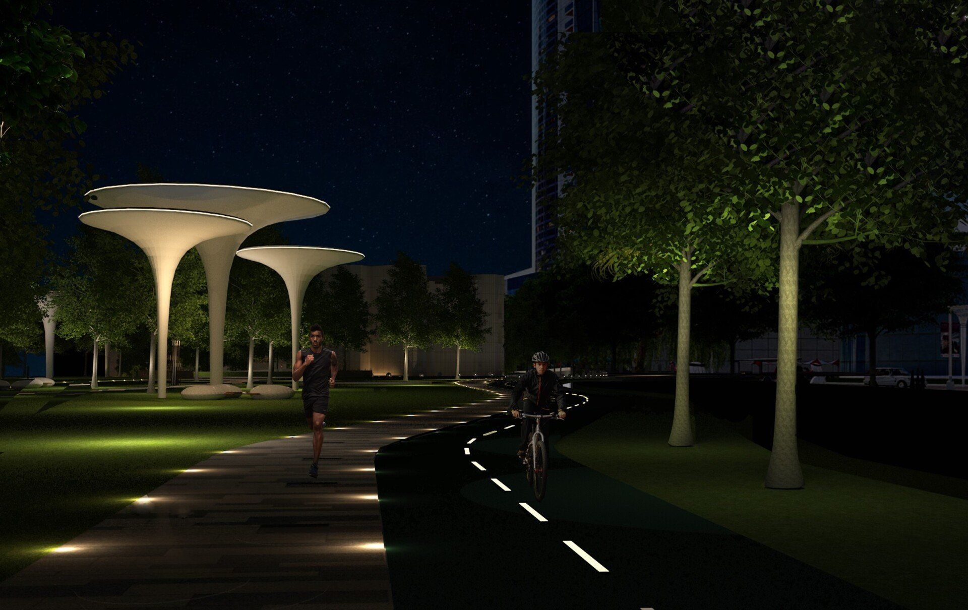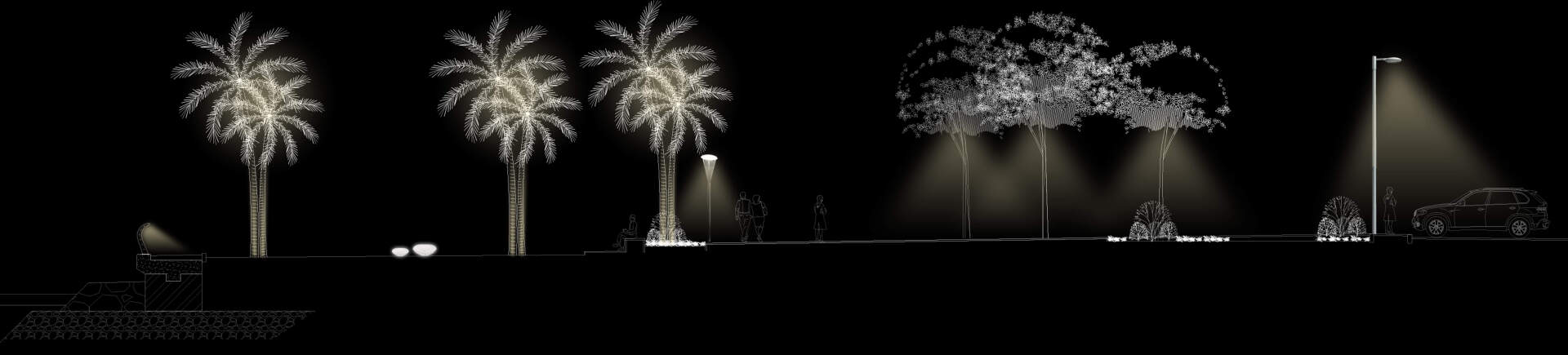 يتبع مفهوم الإضاءة تجربة التغيير في مستويات الإضاءة ، حيث يسير الشخص من جانب المدينة إلى الواجهة البحرية.
