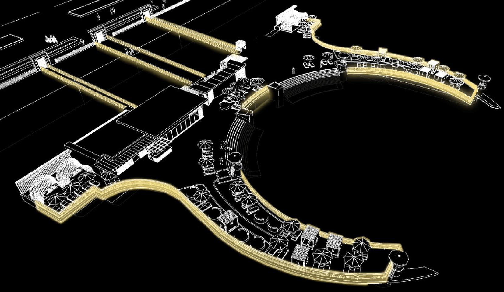 ترتبط الجزيرة العائمة بالبر الرئيسي من خلال ثلاثة جسور بارزة ، كل منها مضاء بإضاءة اتجاهية للمشاة. علاوة على ذلك ، فإن مفهومنا هو الحصول على ضوء خطي غير مباشر يتبع الشكل العام للجزيرة للتركيز على تصميمه العائم وخلق بعض الانعكاسات على الماء