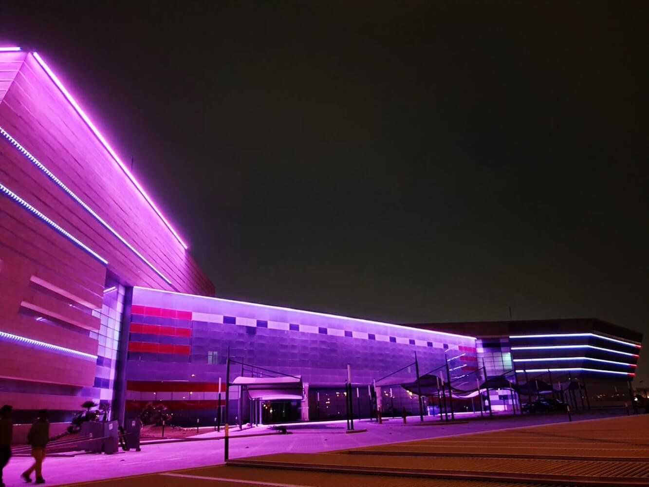 Full RGB wallwashers on all concrete walls while DOT pixels are used to highlight the different levels of the glass panel.